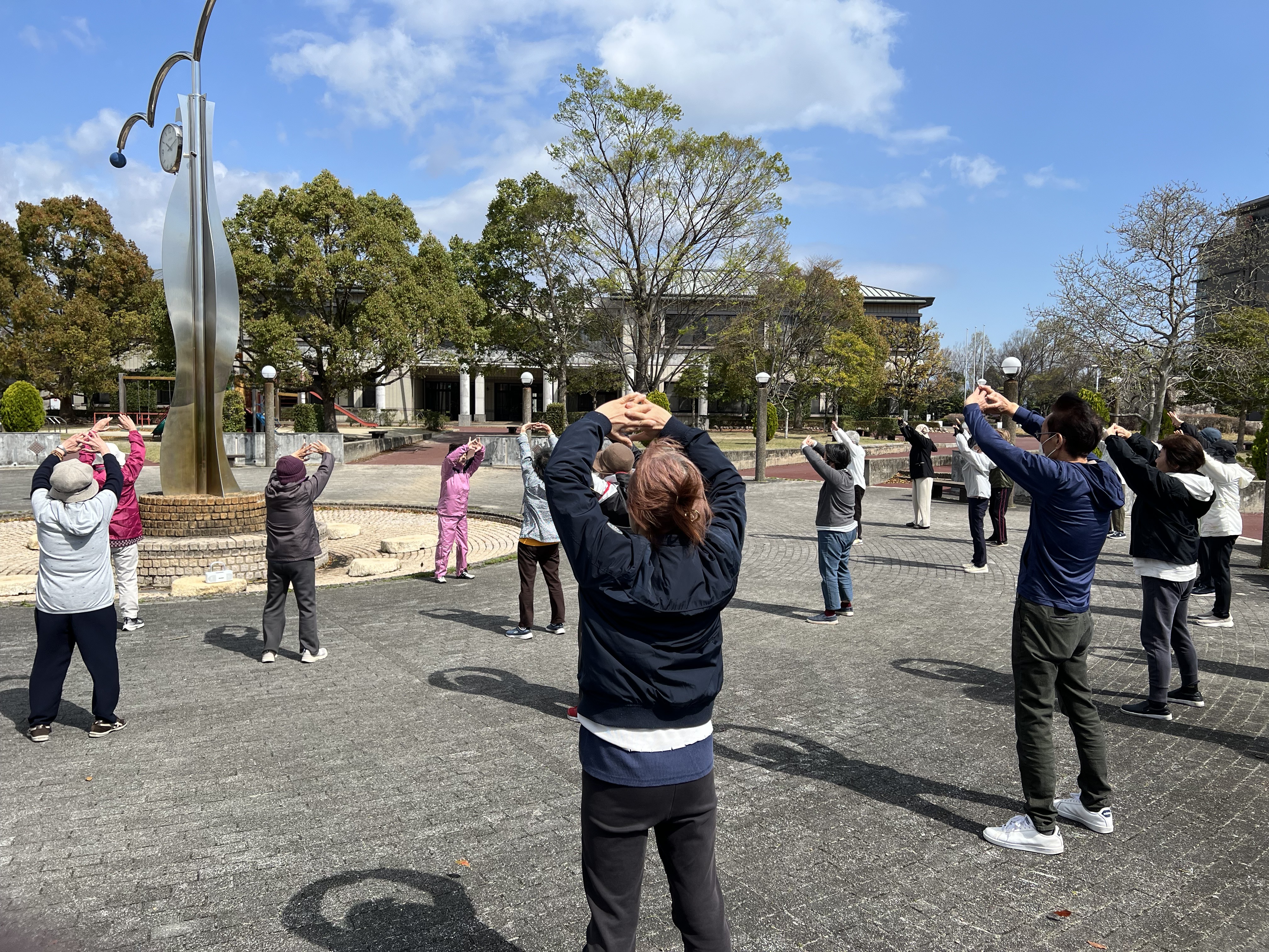 山北先生を中心に立禅、八段錦前半、二十四式演舞、不老拳、太極の華、百花拳、八段錦後半の流れで進み、さくら2・3教室と菰野教室から集まった25名の皆さんと楽しみました。前日の雨も上がり青空の広がる中、穏やかな春の日になるかと思いきや、あまりの強風に片足立ちもままならず、下半身に力を込めての演舞となりました。